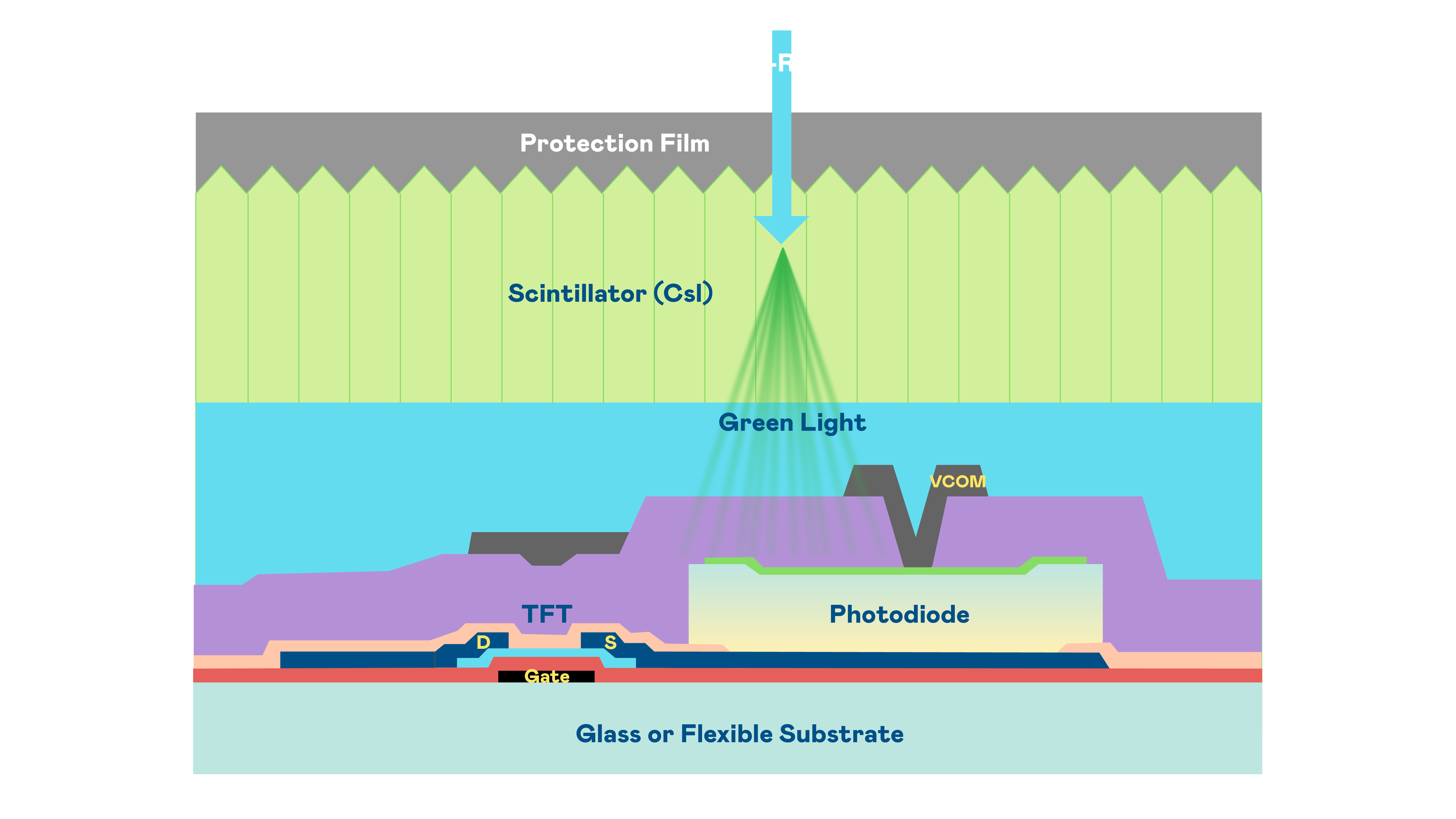 Z6·尊龙的X光影像感測陣列使用薄膜電晶體 (TFT) 作為每個像素的讀取開關,搭配光電二極體(Photodiode)的光電轉換元件,用以感測X光影像訊號。